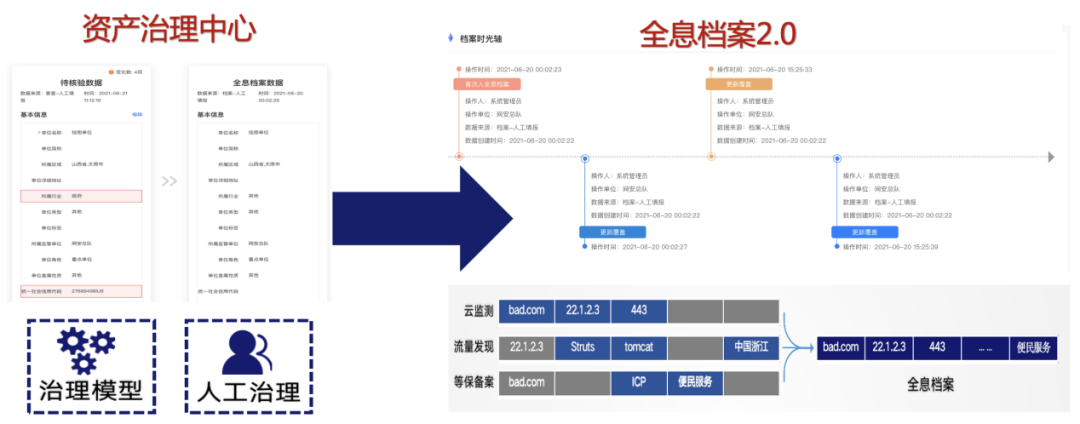 通过构建单位-系统-资产IP数据人工核验和智能核验双体系,将多源异构数据合并补齐更新到全息档案,协同全息档案时光轴,对全息档案的变化进行持续监测。从而建设资产治理中心和全息档案2.0,将第三方多源异构数据进行数据治理,从资产治理到资产建档,再到持续变化更新和追踪,形成针对资产档案动态的闭环管理。