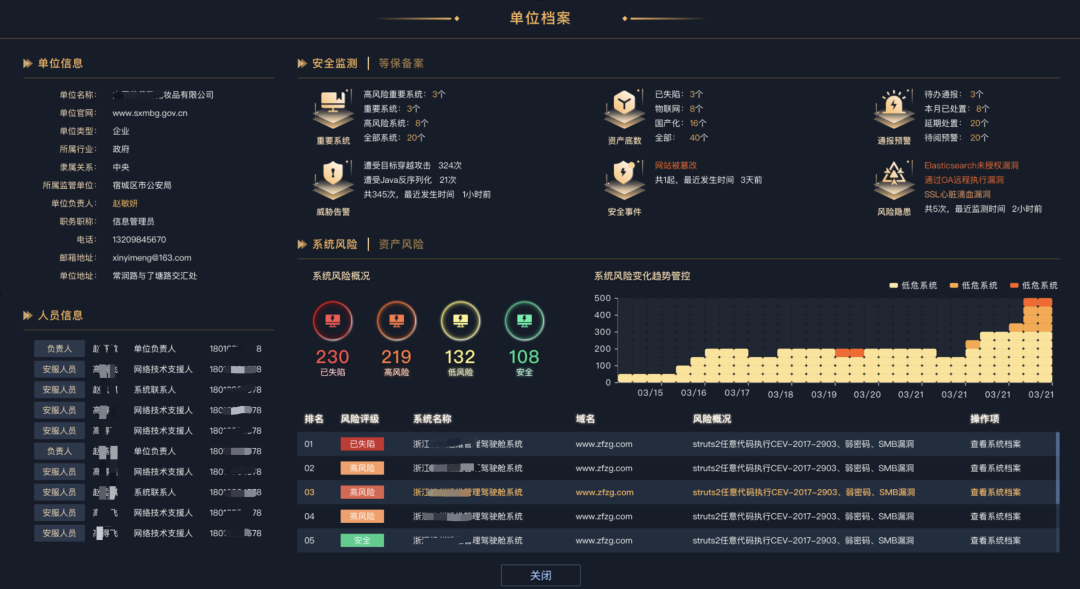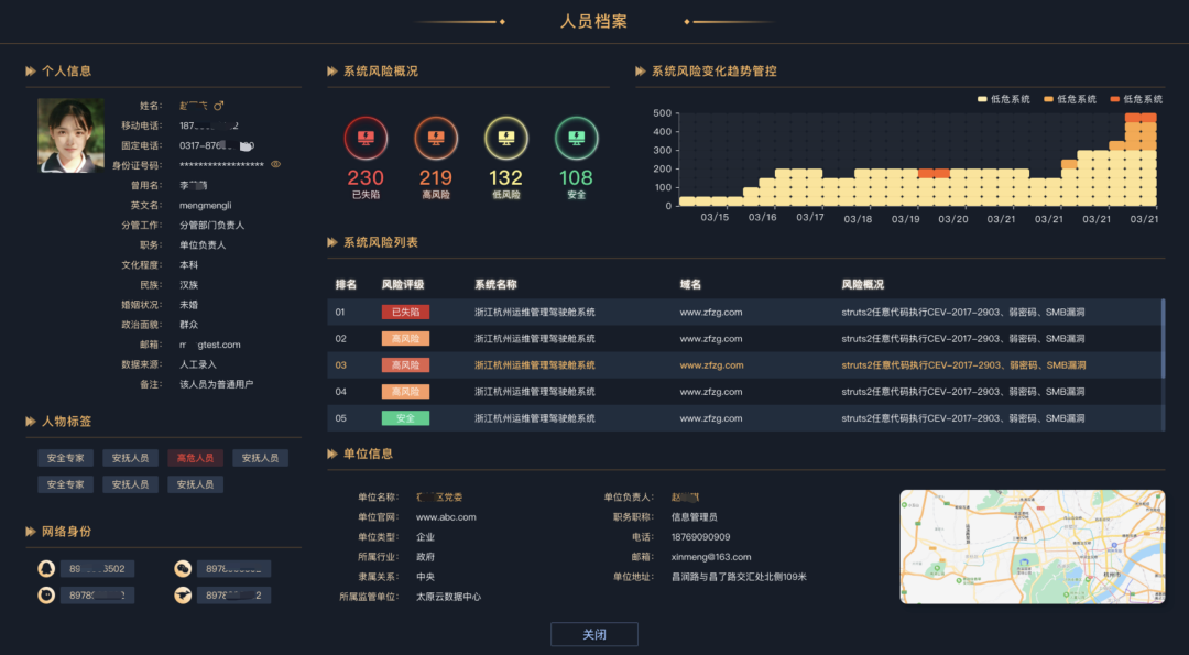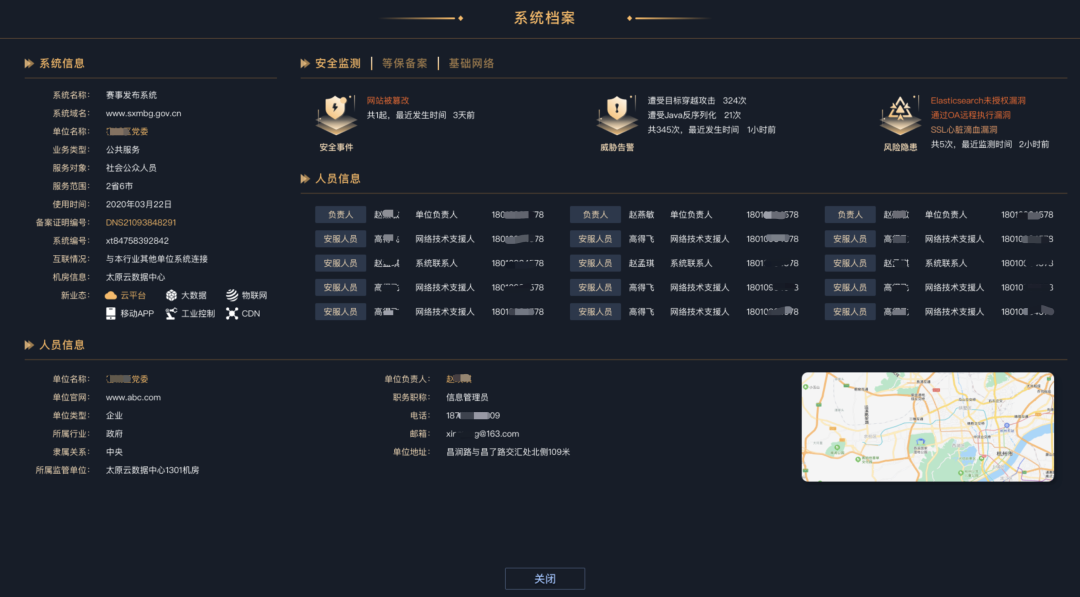 全息系统面临的最新风险隐患,系统负责人是否有违法前科,系统服务依赖的基础网络运行情况。集成应采730+数据采集项,建立六维系统档案,包括安全监测、等保备案、涉关人员、基础网络、归属单位。