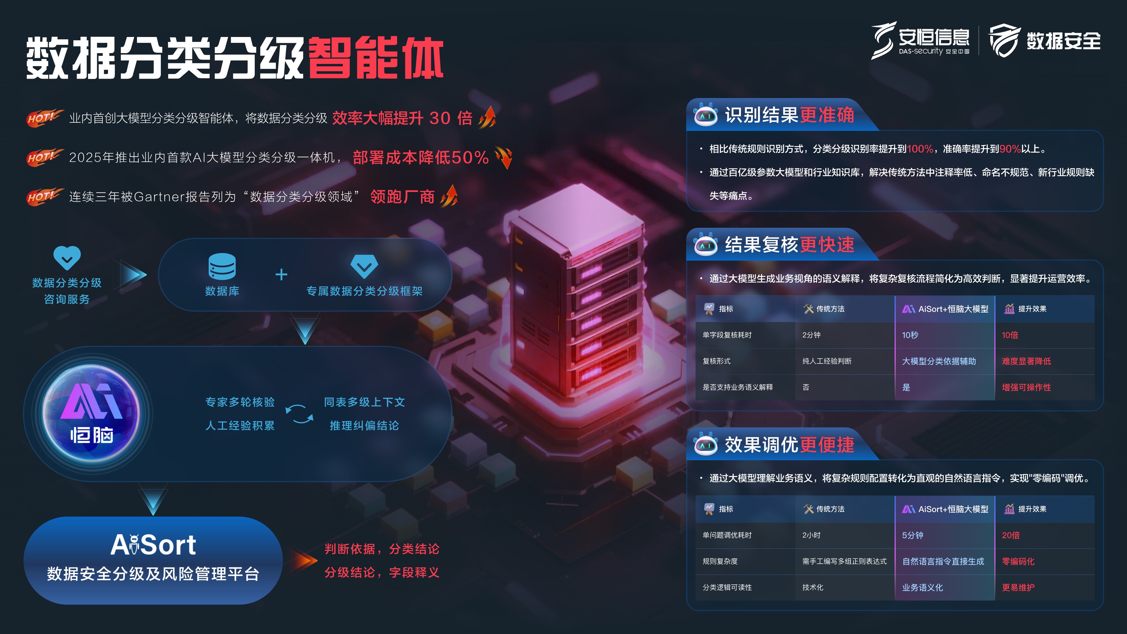 安恒AiSort数据安全分级及风险管理平台能够对用户数据进行自动发现和分类分级。产品基于AI算法实现对敏感数据准确高效识别,内置多行业的法规标准(支持自定义导入)满足多种环境下的分类分级需求。系统支持对用户数据资产进行漏洞评估、安全风险评估,帮助用户从多个维度感知数据资产安全状况。