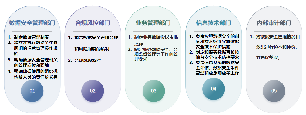 同时指引还针对数据安全管理部门、合规风控部门、业务管理部门、信息技术部门和内部审计部门明确了各部门的数据安全管理职责的责任划分,建立了数据安全工作分工协作的机制。