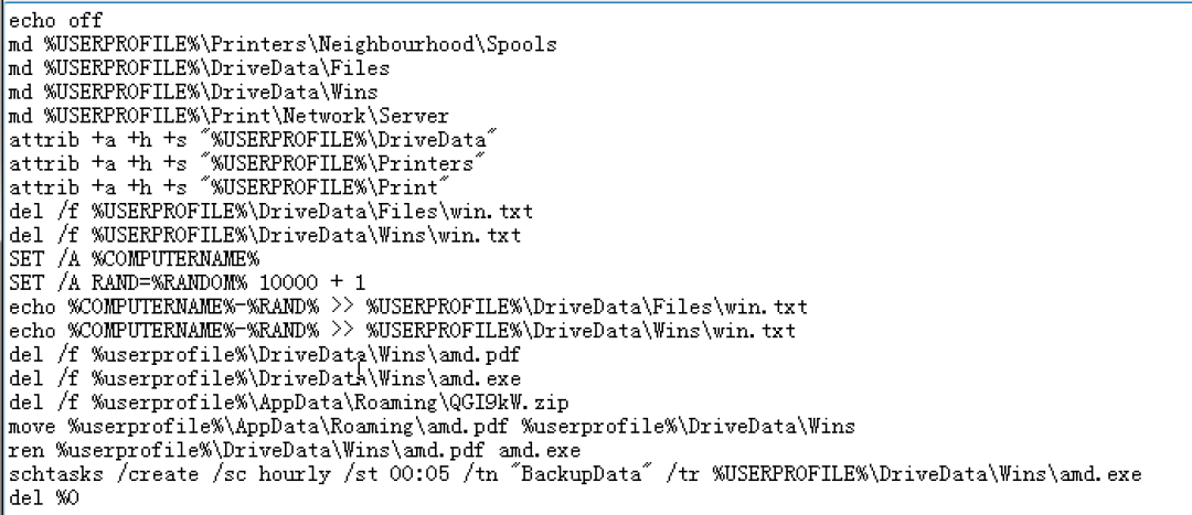 主要目的为创建隐藏文件夹,记录设备基本信息到win.txt,删除自身原文件并移动到当前用户目录%userprofile%\DriveData\Wins下,创建定时任务BackupData 实现持久化。