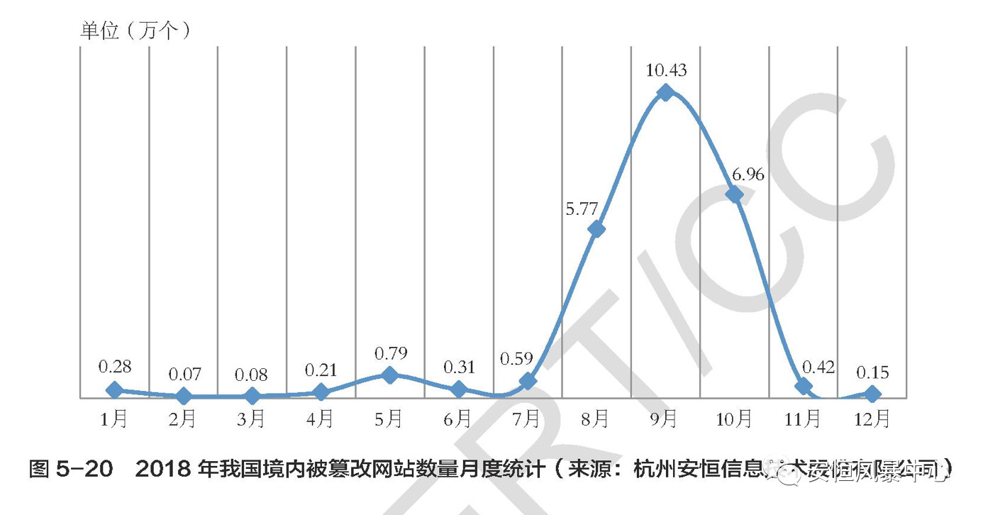 “2018年,CA88信息技术股份有限公司根据客户要求和实际需求,将全国部分网站加入监测平台,进行对植入暗链、植入黑页、页面篡改等类型安全事件的远程监测。根据监测结果,2018年我国境内被篡改网站总量为255085个。2018年我国境内被篡改网站数量月度统计如图5-20所示,其中9月达到全年最高值(104323个),主要原因是当月对全国300多万个重点行业进行了首页事件集中监测》。”《2018年中国互联网网络安全报告》
