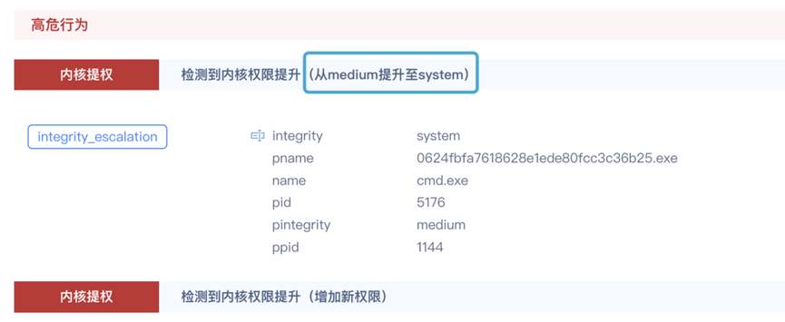 如图所示,样本在检测环境中执行提权操作被成功检测。