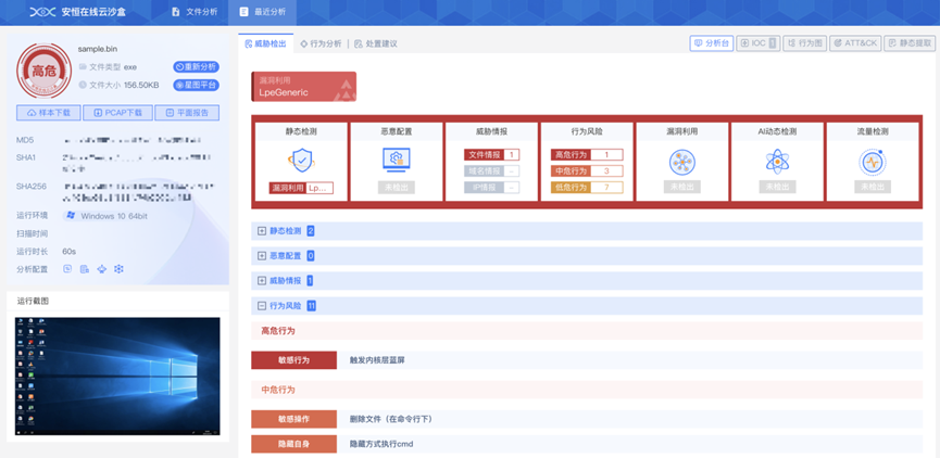 安恒信息沙盒引擎通用内核提权检测框架能够对其进行检测,用户可以通过以下链接查看效果:
