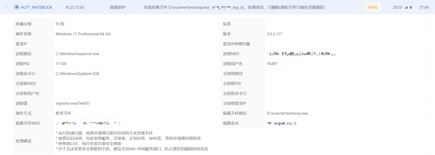 另外,样本在漏洞利用过程中利用失败触发蓝屏,也能命中规则成功检测。