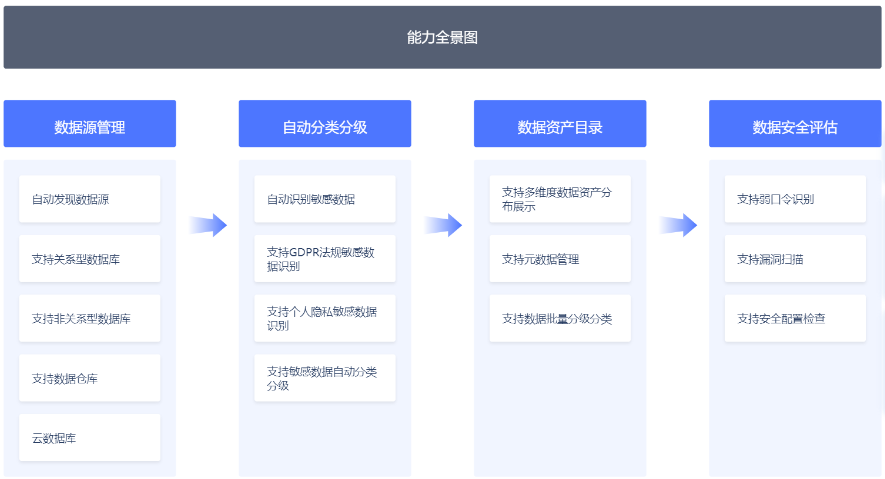 从数据、接口、人员三个视角建立规则模型,对数据归集、处理、共享、交换场景下的数据风险进行全域治理和合规监管,对发现的数据安全风险进行及时预警和通报,建立适应数据动态流动的安全管控机制。以平台为基础工具,可以建立数据层面从【资产识别】→【安全防护】→【监测预警】→【响应处置】→【安全合规】的数据安全监督管控闭环。