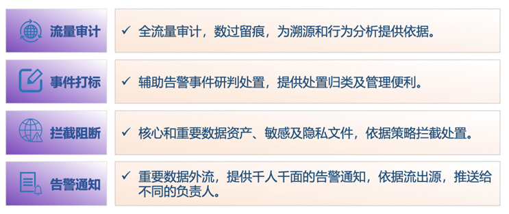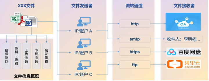 AiDLP数据防泄漏系统对通过安全域内的全流量数据的深度分析,有效识别跨域、跨境等通信行为,对敏感信息输出途径进行控制和审计,通过对外发内容进行全面的还原,甄别网络流量中是否存在限制出域的敏感价值数据,形成详细审计记录,支持对文件内容、IP地址等多因素事件的溯源分析,定位责任人。