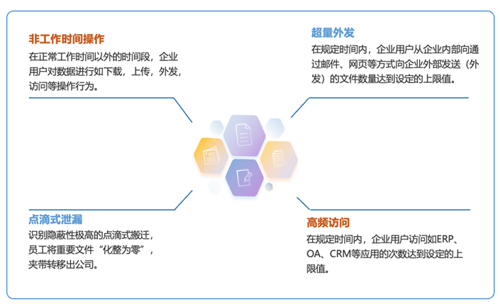 AiDLP数据防泄漏系统支持内部风险人员行为监测,包括对于尝试隐藏、绕过或逃逸等行为进行发现和告警,通过采集和分析流量日志数据,可及时检测到非工作时间操作、高频访问、超量外发、点滴式泄漏等异常行为。