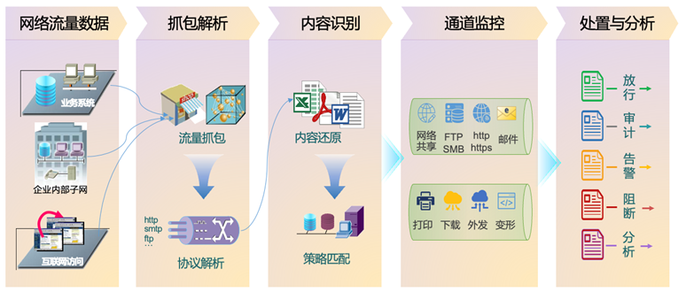 大流量场景下抓包及应用协议解析还原能力,是网络DLP的关键基础能力。安恒AiDLP在10Gbps流量环境下,具备全流量数据抓包分析能力。产品支持对HTTP、HTTPS、SMTP、POP3、IMAP、FTP、SMB、NFS等协议解析,对协议所承载的数据内容进行还原,实现实时双向流量的内容审计。支持旁路、串接、Agent引流等多种部署模式,实现物理环境或者云环境下业务系统流量的灵活接入。