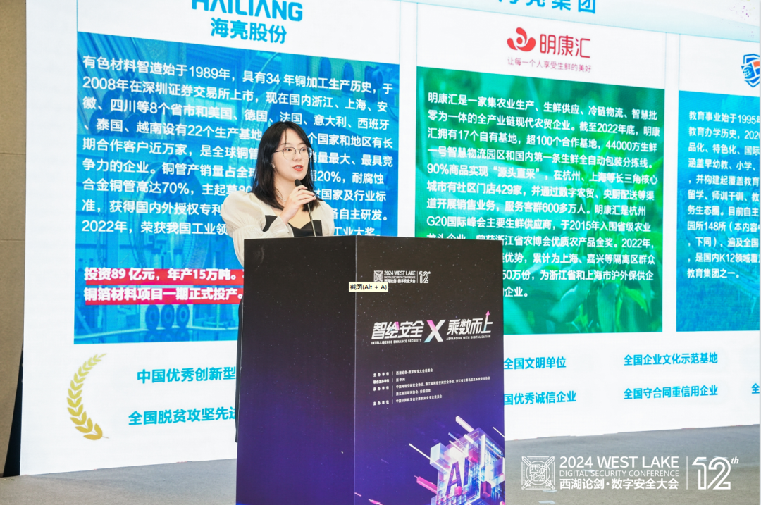 孙雯分享了海亮集团数字化转型经验。她指出,数字化转型是海亮集团战略规划的重要组成部分,也是未来高质量发展的核心力量。在全面的数字化转型工作推进过程中,安全保障将作为主线工作贯穿始终,海亮集团携手安恒信息,从“事前-事中-事后”做好端到端全面安全防护,构建“113N”安全能力,外抵攻击、内防泄露,实现了“数据乘风破浪、安全保驾护航”的目标。